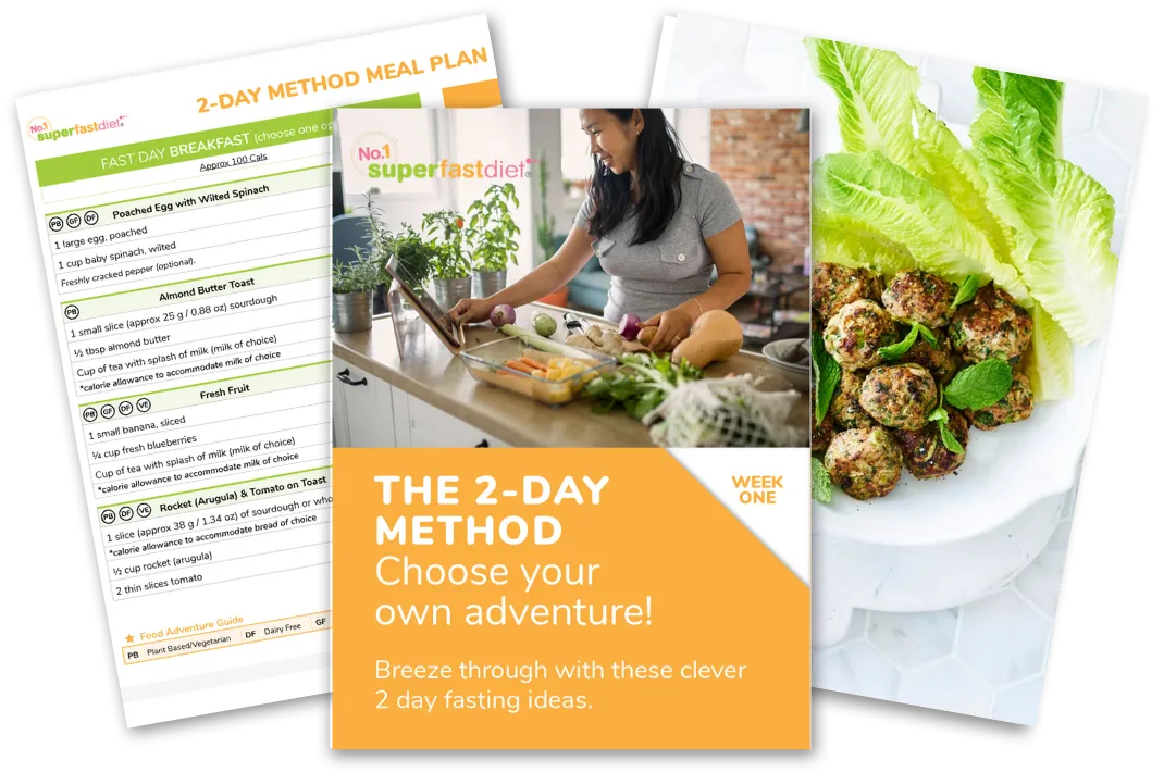 Fast 3 days a week, but with double the calories (1,000). Three full meals, even on fasting days. Faster results, still completely doable. Great if you want to see the scales move quickly.